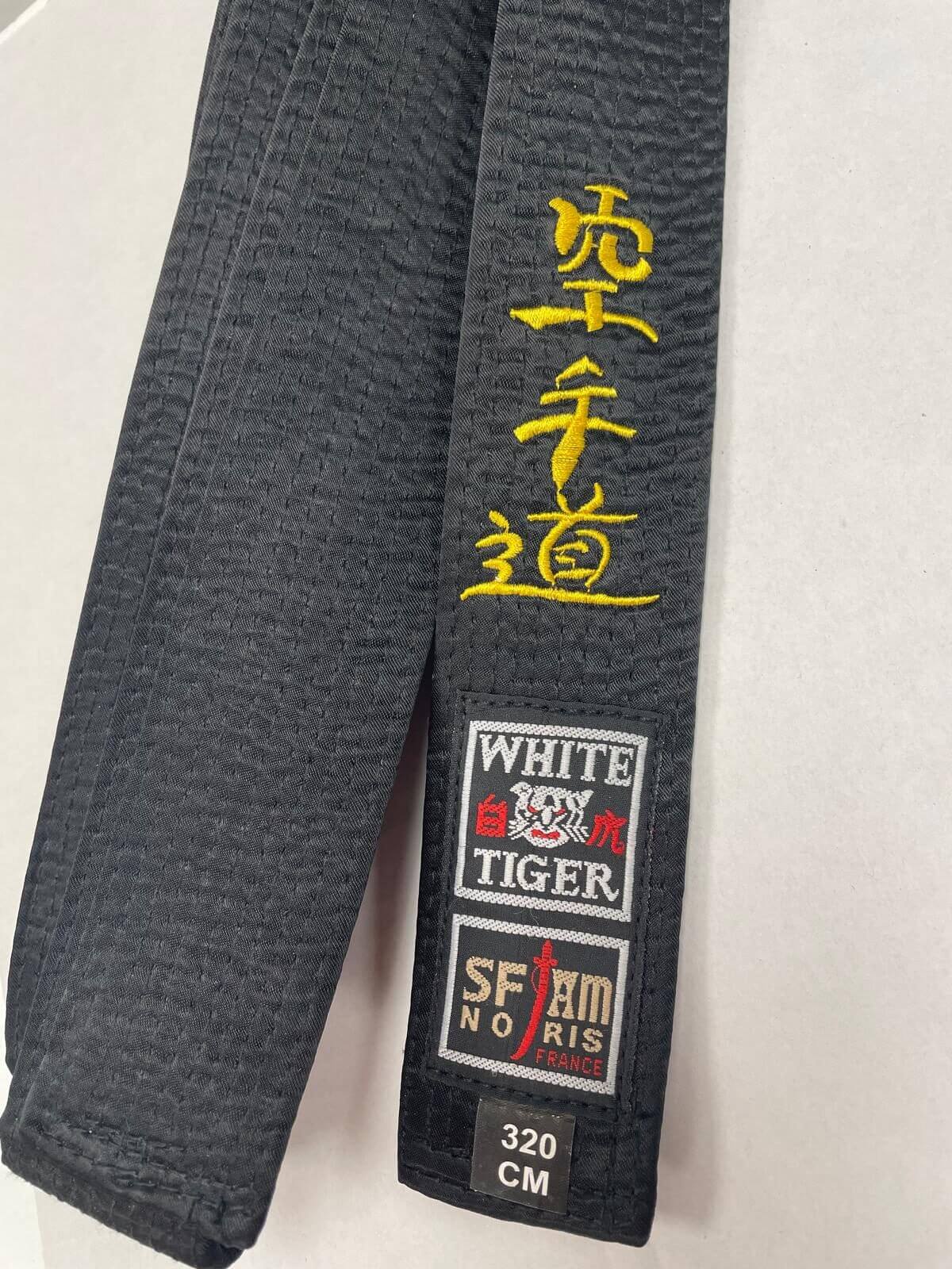 Schwarzer Gürtel aus Satin Noris White Tiger 320 cm, bestickt mit "Karate Do" in Gelb