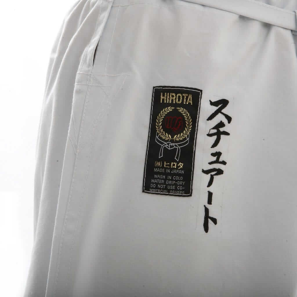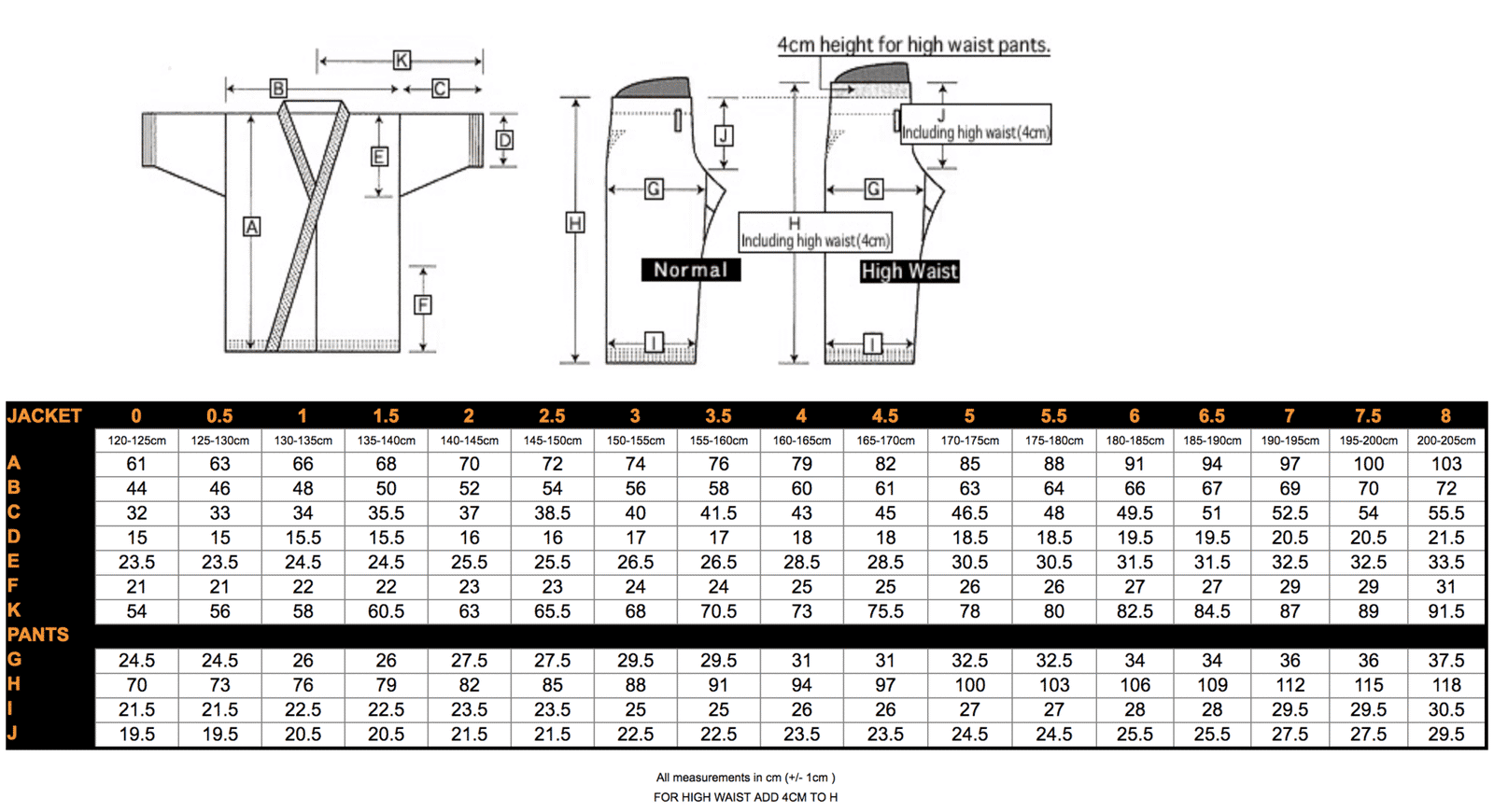 Größenangleichung: Die Größen auf Karate-gi entsprechen dem höchsten Wert in der Tabelle Hirota. Zum Beispiel entspricht die Größe 170 auf Karate-gi der Größe 4,5 / 165-170 cm bei Hirota