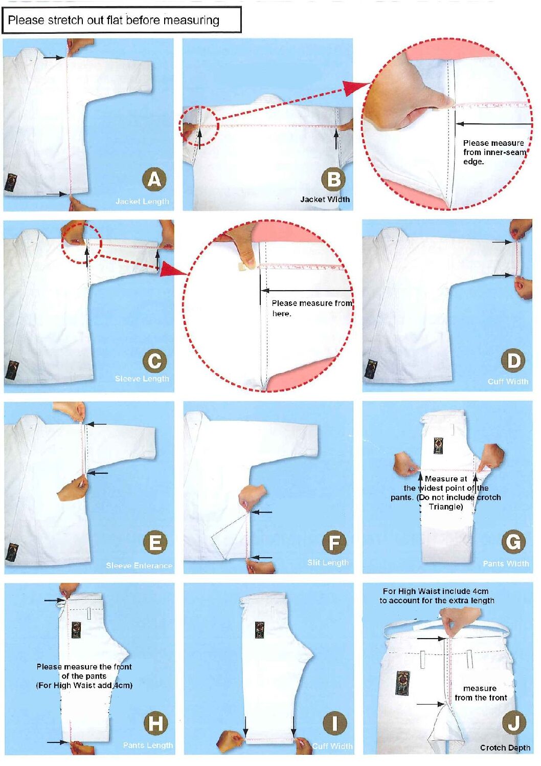 Es ist ratsam, den Karateanzug etwa 5 cm länger als Ihre Körpergröße zu wählen.