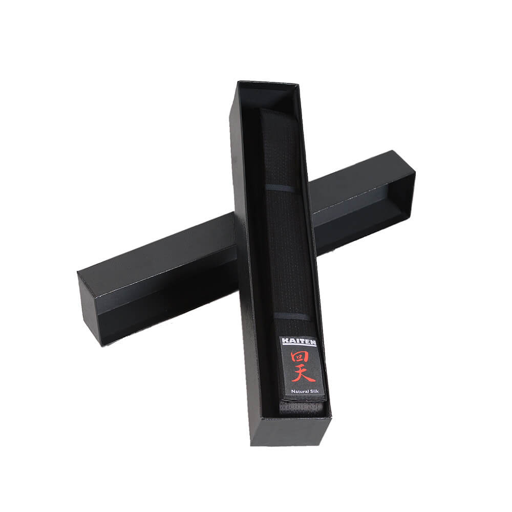 Schwarzer Gürtel aus Naturseide Kaiten in verschiedenen Größen erhältlich. Der schwarze Gürtel aus Naturseide wird in einer hübschen Geschenkbox geliefert.